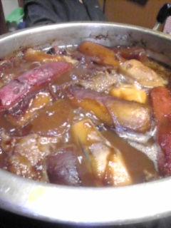 今夜の具は、サトイモ、ちぎりコンニャク、大根、牛スジ、卵、ちくわ、牛蒡、練物(ウチでははんぺんと呼ぶ)でした。
