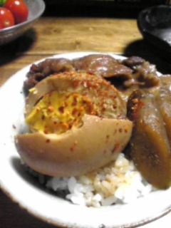 締めは味噌煮の卵をご飯に乗せて、割って、たっぷりの味噌をかける!