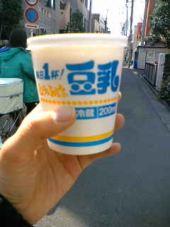 稽古場のそばの豆腐屋で豆乳を買って飲みました。